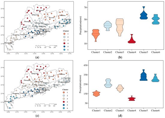 The clustering results regarding TC precipitation in the FRS and NRS are quite different from those of the SRS and for the WY. Regarding the FRS, stations in Cluster 5 and Cluster 6 have more TC precipitation and are located in the middle of the coastal zone (Jiangmen, Zhongshan, Zhuhai, and Shenzhen) and in the eastern coastal zone (Shanwei, Jieyang, Shantou, and Chaozhou). The TC precipitation recorded by these stations exceeds 40 mm, whereas stations in the western coastal zone have relatively less TC precipitation. Regarding the NRS, the stations of Cluster 5, Cluster 6, and Cluster 2, which have more TC precipitation, are also distributed in the coastal area, but the amount of TC precipitation decreases from west to east along the coastal zone. Stations located on the Leizhou Peninsula have relatively greater TC precipitation in the NRS, with some stations recording TC precipitation that exceeds 70 mm. These findings are consistent with the results reported in the previous sections.