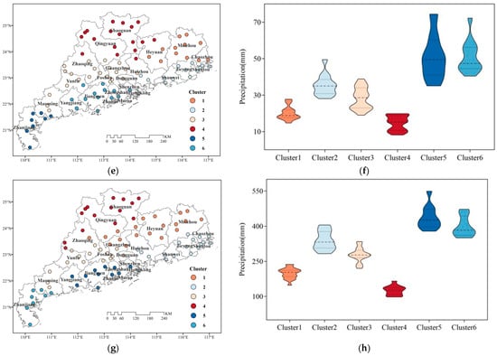 In order to explore the differences in TC precipitation among the various stations in the FRS, SRS, and NRS, and for the WY, we used the k-means clustering algorithm, based on the spatial adjacency relationship, to cluster the 86 meteorological stations. The optimal number of clusters was set at six, according to the elbow method and the silhouette coefficient. The left column in Figure 9 shows the spatial distribution of the six types of stations in the different periods, while the right column presents violin plots depicting TC precipitation at the six types of stations. The spatial distributions of the clustered stations in the different periods are generally consistent, but there are also some differences. The clustering results of the SRS and those for the WY are similar. Stations forming Cluster 5, Cluster 6, and Cluster 2 have higher TC precipitation levels and are evenly distributed in the coastal area. Among them, Jiangmen, Zhuhai, Zhongshan, and Shenzhen in the middle of the coastal zone have the highest TC precipitation; followed by Zhanjiang and Maoming in the west of the coastal zone; while Huizhou, Shanwei, Jieyang, and Shantou in the east of the coastal zone have relatively lower TC precipitation. Stations in the other three clusters have less TC precipitation and are all distributed in the inland areas. Among them, the stations of Cluster 4, which are located in Shaoguan, Qingyuan, and the north of Heyuan, have the least TC precipitation, comprising less than 150 mm in the SRS and less than 200 mm in the WY. Those stations located in the central and western regions of Guangdong Province have more TC precipitation than those in the central and eastern regions.