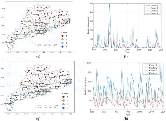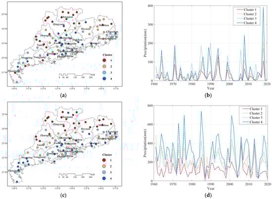 Figure 10 shows the spatial distribution of the four clusters of stations in the FRS, SRS, and NRS, and for the WY, respectively, as well as the corresponding curves of the averaged TC precipitation time series. It is evident that the spatial distribution continuity of the different clusters is not strong for all four periods, but the overall distribution pattern is similar. Stations with more TC precipitation and large inter-annual fluctuations are often distributed in coastal areas, while stations with less TC precipitation and small inter-annual fluctuations are distributed in inland areas. There are also some differences between the four periods. Regarding the FRS, Cluster 4, with the largest fluctuations, is mainly concentrated in Guangzhou, Zhuhai, Shenzhen, Dongguan, and Zhongshan near the Pearl River estuary. Regarding the NRS, Cluster 4, with the largest fluctuations, mainly appears in Maoming and Zhanjiang in western Guangdong, and in Shanwei, Jieyang, Shantou, and Chaozhou in eastern Guangdong, while for the SRS and the WY, Cluster 4, with the largest fluctuations, is distributed throughout the coastal zone of Guangdong. The stations in Cluster 4 often experienced abundant TC precipitation, but the inter-annual variation was also quite apparent, which indicates strong uncertainty. Therefore, more attention should be paid to these stations in terms of the practices regarding flood disaster prevention and mitigation. However, the focus areas should be adjusted for different periods of the year according to the results of the clustering analysis.