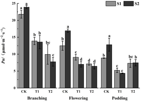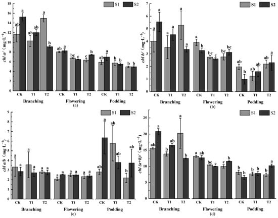 The ratio of chlorophyll a and b (chla/chlb) remained relatively unchanged at the branching and flowering stages (as shown in Figure 1c), and S1 < S2 under both CK and T2 treatments at the podding stage. There were no significant differences between S1 and S2 at any periods and treatments, or among treatments.