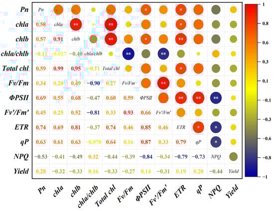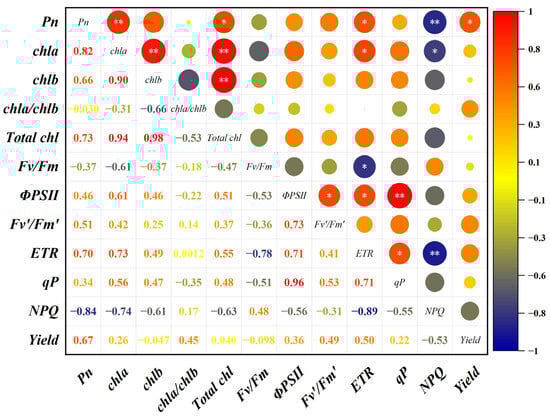 Correlation Analysis between Photosynthesis, Fluorescence and Yield of Parent Soybeans under Elevated O3 Concentrations. *: significant correlation at the p < 0.05 level (both sides); **: significant correlation at the p < 0.01 level (both sides).