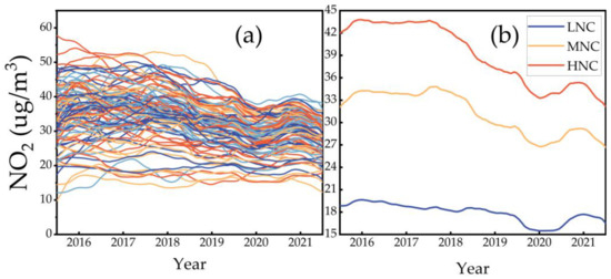 Figure 2a shows a 365-day sliding average of hourly data from 100 cities. Figure 2b displays the curves representing the three types of cities: low NO2 concentration cities (LNC), medium NO2 concentration cities (MNC), and high NO2 concentration cities (HNC), based on their respective NO2 concentrations. The observed “U” change in NO2 concentrations from late 2019 to the first half of 2020 can account for the outbreak of COVID-19 at the end of 2019. This significantly reduced NO2 emissions from public transport and industrial sources during the first half of 2020. Consequently, the gradual resumption of production and work increased NO2 concentrations [38].