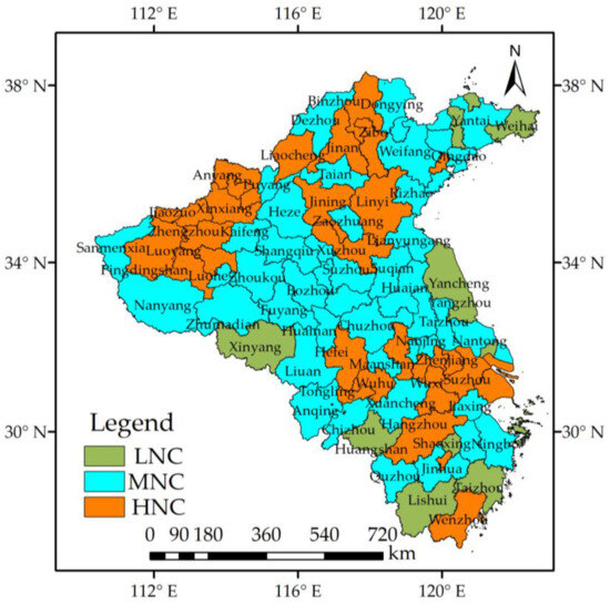 The spatial distribution of the three city types is presented in Figure 3, comprising 15 cities in the LNC, 51 cities in the MNC, and 34 cities in the HNC. The LNC cities primarily consist of popular tourist locations such as Weihai and Huangshan, known for their robust tourism industries, picturesque landscapes, and good air quality. In contrast, the HNC encompasses major cities such as Shanghai, Nanjing, and Hefei alongside cities characterized by a robust industrial presence. The MNC category falls between the LNC and HNC categories.