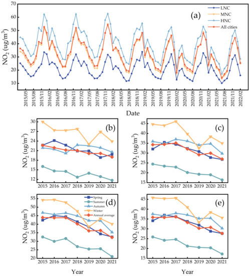 Figure 4. The monthly and seasonal distributions of NO2 concentrations from 2015 to 2021. (a) Month changes in different types of cities; (b) LNC; (c) MNC; (d) HNC and (e) all city annual trends in NO2 concentrations.