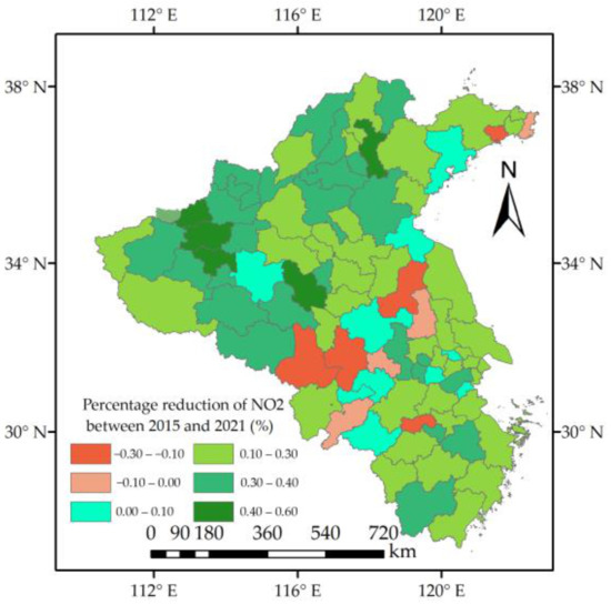 Figure 5. Percentage reduction in NO2 concentration between 2015 and 2021.