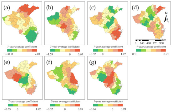 Figure 6. Spatial distribution of (a) POP, (b) PGDP, (c) UR, (d) IS, (e) EC, (f) CG, and (g) CV coefficients in the GTWR model.