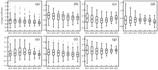Figure 7. Temporal distribution of (a) POP, (b) PGDP, (c) UR, (d) IS, (e) EC, (f) CG, and (g) CV coefficients in the GTWR model.
