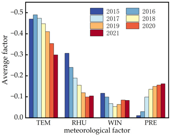 Figure 8 illustrates the annual variations in the mean coefficients of various meteorological factors from 2015 to 2021. The average coefficients for TEM and RHU have generally decreased in recent years. The study found that the inhibitory effect of temperature on NO2 concentration was most significant at lower temperatures and stabilized at higher temperatures. Additionally, NO2 can be effectively removed from the air only when the relative humidity is high [45]. The trend of WIN is decreasing and then increasing; the average coefficient of PRE is increasing year by year, and the increase is most obvious in 2017.