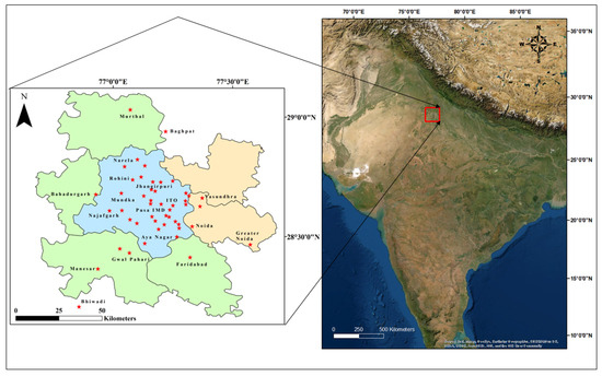 The locations of all the above-mentioned sites are shown in Figure 1. Before processing, the data was thoroughly reviewed several times. There were locations where the data was either not accessible or continuous for a few to several days in different years from 2019 to 2021. Such data sets were excluded after rigorous observation and analyses. The average value before and after the missing day was used, processed, and compared with the closest CPCB station data available if one day’s worth of data was missing. Monitoring stations that had more than 60% valid data during the analysis period were taken into consideration. Additionally, we performed an outlier analysis on each pollutant data set to remove any odd data. We noted that Delhi’s data on air quality monitoring stations is superior in terms of the number of parameter observations and the consistency of the data sets. To guarantee the accuracy of the measured data, the CPCB maintains a Quality Assurance/Quality Control program that comprises instrument calibration and maintenance, training, standards for monitoring ambient air quality, and the evaluation of monitoring stations (https://cpcb.nic.in/quality-assurance-quality-control/, accessed on 5 April 2022). Monthly average values from individual monitoring stations were used for map preparation. Maps were created using the Kriging interpolation method in Arc GIS software.