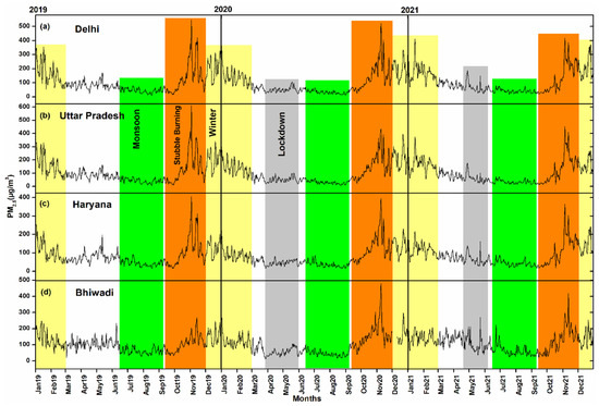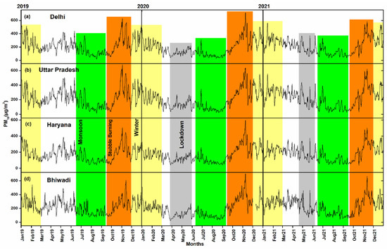 The time series of daily mean PM2.5 and PM10 over Delhi and the adjacent regions during the years 2019, 2020, and 2021 are shown in Figure 2 and Figure 3, respectively. Particulate matters showed great temporal variability with the highest concentration in the winter (highest in November, followed by January/December) and the relatively lower concentration in summer. The lowest annual particulate matter concentration was seen during monsoon seasons over all the studied regions (Figure 2a–d and Figure 3a–d).
