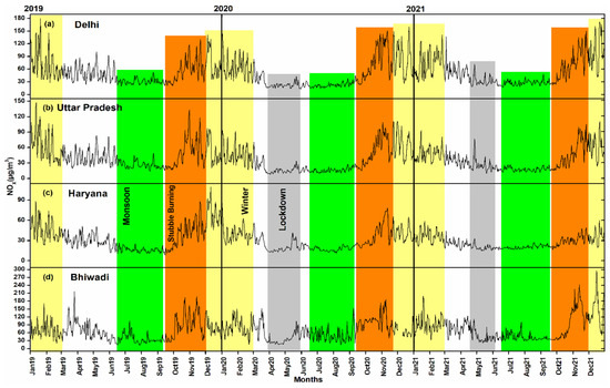 Graphs showing day to day variations of NOx concentration over (a) Delhi, (b) studied regions of Uttar Pradesh, (c) studied regions of Haryana, and (d) Bhiwadi from the year 2019 to 2021. The highlighted grey region represents lockdown periods (25 March to 31 May 2020 and 20 April to 7 June 2021), the green color represents monsoon seasons (July to September), the light yellow color represents winter seasons, and the orange color represents the stubble burning period over the study area.