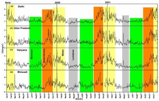 Graphs showing day to day variations of CO concentration over (a) Delhi, (b) studied regions of Uttar Pradesh, (c) studied regions of Haryana, and (d) Bhiwadi from the year 2019 to 2021. The highlighted grey region represents lockdown periods (25 March to 31 May 2020 and 20 April to 7 June 2021), the green color represents monsoon seasons (July to September), the light yellow color represents winter seasons, and the orange color represents the stubble burning period over the studied area.