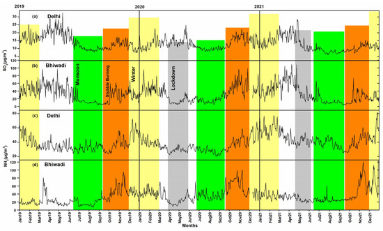 Due to the large data gaps in Haryana and UP, NH3 and SO2 distributions were studied only for Delhi and Bhiwadi from 2019 to 2021. The time series of the daily mean of SO2 and NH3 over Delhi and Bhiwadi are shown in Figure 6a–d. Considerable variation was observed in the mean monthly concentration of SO2 between Delhi and Bhiwadi (Figure 6a,b). A significantly higher SO2 concentration was found in Bhiwadi compared to Delhi in almost all the years. Relatively higher SO2 values were observed during summer/pre-monsoon time, and the lower SO2 concentration was found during monsoon, followed by post-monsoon/winter seasons. In 2020, the SO2 concentration was consistently lower during pre-monsoon (lockdown period) and monsoon seasons in Bhiwadi. In terms of NH3, a relatively higher concentration was found during post-monsoon/winter seasons and a lower NH3 level was observed during pre-monsoon/monsoon seasons (Figure 6c,d). The average annual SO2 level was found to be 14.8 ± 1.2 µg/m3 in 2019 (highest), 13.2 ± 0.7 ± 0.7 µg/m3 in 2020, and 12.1 ± 1.2 µg/m3 (lowest) in 2021 over Delhi, and 31.95 µg/m3 in 2019 (highest), and 30.80 µg/m3 in 2020, and 30.74 in 2021(lowest) over Bhiwadi. In terms of NH3, the annual mean concentration was found to be 37.02 ± 2.1 µg/m3 in 2019, 34.8 ± 2.3 µg/m3 in 2020 (lowest), and 44.4 ± 2.7 µg/m3 (highest) in 2021 over Delhi, and 27.6 ± 4.2 µg/m3 in 2019 (lowest), 39.7 ± 4.1µg/m3 in 2020 (highest), and 37.2 ± 5.3 µg/m3 in 2021 over Bhiwadi (Table 1).