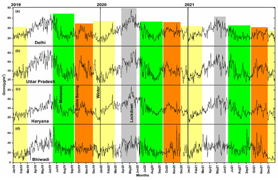 Unlike other pollutants, the monthly mean concentration of O3 exhibited significant variability (increase and decrease) over the studied regions. Figure 7 shows the time series of daily average ozone values over Delhi, Uttar Pradesh, Haryana, and Bhiwadi from 2019 to 2021. Month-wise average O3 distribution shows a strong seasonal variation. In all the years, the O3 level was significantly lower in winter seasons (November–January) and Monsoon seasons (July to September) due to a lesser amount of insolation and cloud cover. The surface ozone concentration starts increasing gradually from March onwards due to the rise in temperature and reaches its maximum concentration during pre-monsoon seasons (May and June). The O3 level starts decreasing in monsoon seasons and reaches its lowest values during peak-monsoon seasons. After the monsoon seasons, the surface O3 level again starts increasing in October (again due to clear sky conditions and a higher amount of insolation), and a further decrease in November and similar lower values continues up to February (Figure 7).