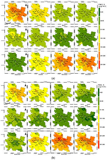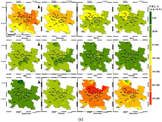 Significant spatial variability is clearly seen in month-wise averaged PM2.5 distribution maps in 2019, 2020, and 2021. In all the years, despite considerable seasonal variation, the highest pollution concentration was mostly found in the North and East Delhi regions (DTU, Bawana, and Jahangirpuri), Ghaziabad, Noida, Faridabad, IMT-Manesar, and Bhiwadi (Figure 8a–c).