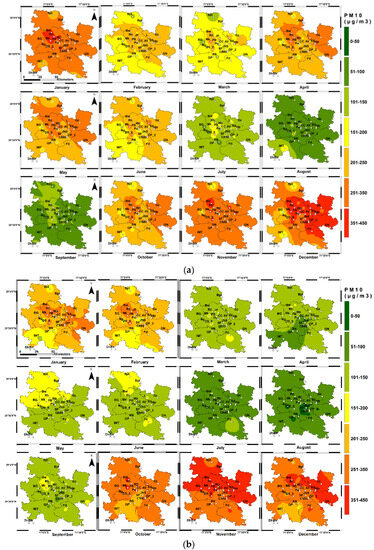 Unlike PM2.5, relatively less spatial variability was observed in the PM10 mass concentration during the three years over the study area (Figure 9a–c) The higher concentration of PM10 was mostly found in the North and East Delhi regions (Bawana, Jahangirpuri, Wazirpur, Mundka, Rohini, and Anand Vihar), Ghaziabad (Loni and Vasundhara), Greater Noida, Faridabad, Gurugram and Bhiwadi, which can be clearly seen in Figure 9.