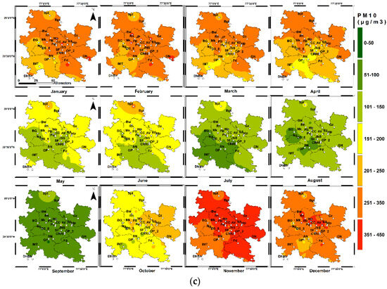 Map showing the month-wise spatial distribution of PM10 over the study area (Delhi NCR) in (a) 2019, (b) 2020, and (c) 2021.
