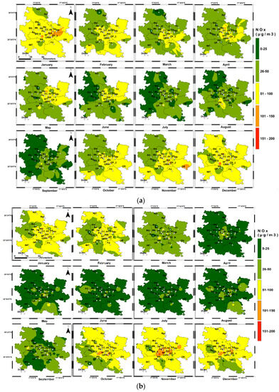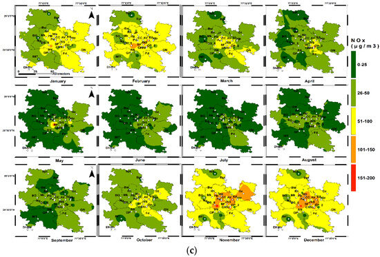 Like particulate matter, the spatial distribution of the monthly average NOx level shows considerable variability (Figure 10a–c). Higher NOx concentration with lesser variability was in winter seasons, and less concentration with relatively more variability in summer seasons over the study area. In 2019, the highest annual average NOX concentration was seen at Anand Vihar (126.98 ± 3.6 µg/m3), followed by CRRI Mathura Road (98.79 ± 3.8 µg/m3), JN stadium (84.3 ± 2.9 µg/m3), IGI Airport (81 ± 3.1 µg/m3), and MCDN stadium (79.6 ± 2.9 µg/m3). In 2019, the highest NOx concentration was over Indirapuram (60.50 ± 2.1 µg/m3) in UP and in Panipat (62.17 ± 3.5 µg/m3) in Haryana.
