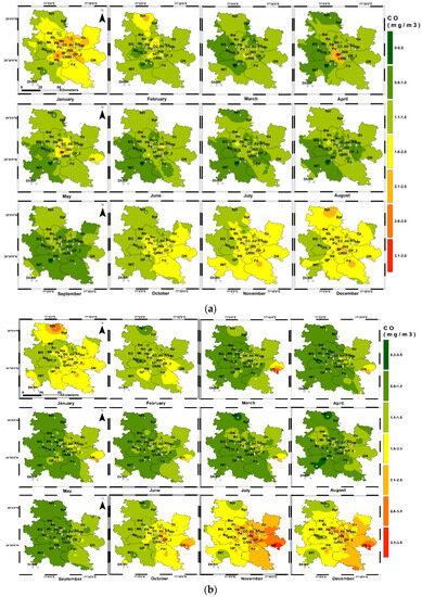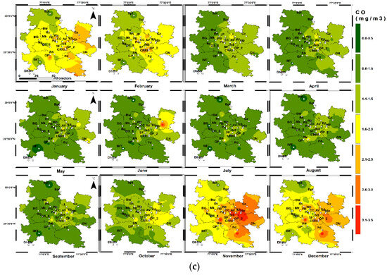 Like other pollutants, a relatively higher concentration of CO was seen mostly in winter and a relatively lower concentration during summer (Figure 11a–c). The highest annual average concentration was found over North Campus Delhi University (2.22 ± 0.07 mg/m3), followed by Anand Vihar (2.16 ± 0.04 mg/m3), JN stadium (1.91 ± 0.04 mg/m3), Jahangirpuri (1.92 ± 0.03 mg/m3), and Punjabi Bagh (1.73 ± 0.03 mg/m3) in 2019.