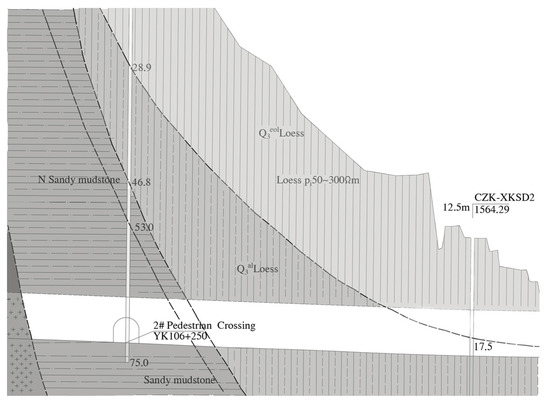 This study focuses on the Xia-Kou Tunnel, and its engineering geological cross-section is depicted in Figure 1. The tunnel site is located in Qingshui, Gansu, China, and it comprises the separate double tunnels for the left and right lines. The overlying strata in the tunnel site area consists of the Quaternary Holocene slope deposits (Q4dl) containing gravel, Upper Pleistocene aeolian deposits (Q3eol) of loess, alluvial (Q3al) loess, rounded gravel, and underlying Neoproterozoic (N) sandy mudstone. The sandy mudstone is characterized as being a very soft rock with poor weathering resistance, prone to softening and disintegration in water, cracking upon water loss, collapsing in the arch post-excavation, deforming the sidewall, and exhibiting poor surrounding rock stability. Loess is marked by self-weight subsidence, poor self-stability, and a tendency for arch and sidewall collapse following excavation. Under the condition of water and air drying, the properties of the sandy mudstone and loess will change, seriously threatening the stability of tunnel support structure [13].