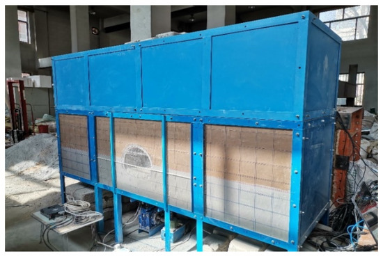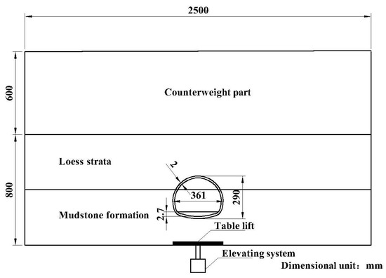 The model test system, as illustrated in Figure 2, comprises a test model box, a lifting system, a lifting electric control system, a data acquisition system, and a model counterweight. The model box measures 2500 × 800 × 1400 mm. Plexiglas panels are employed on the side of the model box to facilitate observation of changes in the tunnel and surrounding rock, while steel plates are utilized in other parts of the model. The lifting and lowering of the platform plate are achieved by adjusting the servo motor, enabling the realization of basement expansion loading methods. This simulates the deformation characteristics of the tunnel surrounding rock and lining under the influence of basement uplift.
