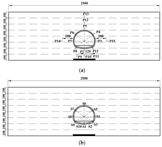 Monitoring issues encompass circumferential rock pressure, lining force, and displacement. The test elements involved earth pressure boxes for collecting circumferential rock pressure at characteristic locations, such as footings, vault tops, and sidewalls, with a total of 15 monitoring points. Strain gauges were employed to gather the circumferential strain on the inner and outer sides of the liner, with 10 monitoring points arranged on both sides. Displacement gauges were utilized to capture the deformation in the radial direction of the lining and the top of the filling layer at characteristic points, with a total of 6 monitoring points. The arrangement of the measuring points is depicted in Figure 3.