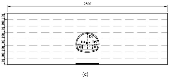 Monitoring element layout diagram (mm). (a) Diagram of the geotechnical pressure box arrangement. (b) Schematic diagram of the strain gauge arrangement. (c) Displacement meter arrangement diagram.