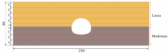 Over the years, China’s rapid economic growth and the continuous promotion of the land and maritime Silk Road initiative have necessitated the construction of numerous tunnels across composite stratum areas. These composite strata exhibit significant differences in the physical and mechanical properties, as well as the engineering geology characteristics. Consequently, tunneling through such strata will potentially lead to the tunnel collapse, back-arch bottom bulging, support structure deformation, and other issues, posing serious threats to the tunnel operational safety. In loess regions, the loess–mudstone binary structure is a typical mountain structure pattern, characterized by the overlying loess and underlying bedrock (mudstone) [1]. Mudstone is a special geological body between soil and rock, which shows the characteristics of water absorption and expansion. The physical and mechanical properties of mudstone will be deteriorated when it encounters water, which can easily result in the bulging failure of the tunnel’s inverted arch [2,3]. The floor heave failure of the tunnel inverted arch is related to the geological structure, geological environment, load conditions, type design, and construction quality [4]. The substantial differences in the loess and mudstone properties result in the bearing capacity of the surrounding rock at their intersection being severely inadequate. Consequently, the deformation and damage of the tunnel surrounding rock and support structure after excavation is a pressing issue that must be addressed during the construction of loess–mudstone tunnels.