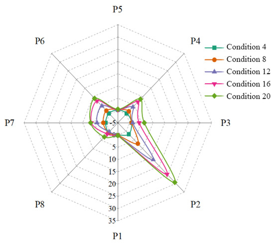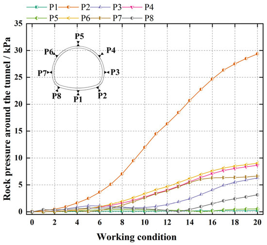 Pressure values of the surrounding rock under five loading conditions (from working condition 4 to 20) were extracted from eight measurement points around the tunnel. These values correspond to the pressure distribution of the rock under different working conditions, as illustrated in Figure 7.
