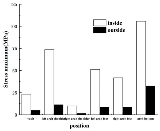 From Table 2 and Figure 8, it is evident that in the loess–mudstone stratum, the tunnel lining is characterized by compression at the two arch feet on the inner side of the liner, and is characterized by tension at the top, shoulders, and bottom of the arch. Conversely, the outer side of the liner experiences tension at the left and right arches, while it experiences compression at the top, shoulders, and bottom of the arches. The peak stresses are depicted in Figure 7. It can be observed that the peak stresses on the inside of the tunnel liner at each characteristic point are higher than those on the outside, under the effect of the substrate expansion. The peak stresses on both the inner and outer sides of the arch bottom are the largest, with the magnitude of the peak stress on the outer side being 30.8% of that on the inner side. The magnitude of the peak stress on the outer side of the arch shoulder is 15.5% of that on the inner side.