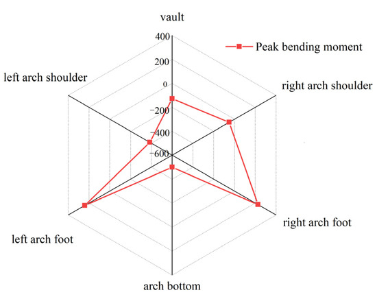 From the peak distribution of the lining moment in Figure 9, it is evident that the maximum bending moment at each characteristic point of the tunnel lining is prominent in the inverted arch part. The overall bending moment of the inverted arch is larger than that of the arch shoulder and the arch roof. The arch bottom and the left arch shoulder primarily experience negative bending moments, with maximum values close to −500 kN·m and −400 kN·m, respectively, while the left and right arch feet undergo positive bending moments. Given the overall distribution, it can be observed that the lining elevation arch and the left and right arch shoulders represent the unfavorable positions of the force. Consequently, it is necessary to strengthen the lining structure in a targeted manner to address these vulnerabilities.