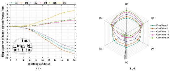 Variation and distribution of the tunnel displacement in relation to working conditions. (a) Variation in the circumferential displacement with working condition. (b) Displacement distribution around the tunnel.