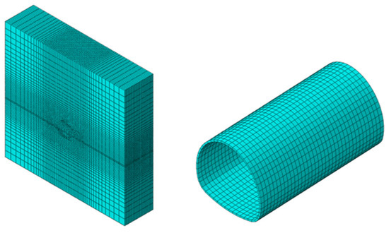Based on the principle of St. Venant, considering the accuracy of the numerical simulation, on-site stratigraphy, and calculation cost, the width, height, and longitudinal length of the model size were 100.96 m, 99.1 m, and 24 m, respectively. The form of tunnel section was determined according to the construction drawings, in which the span and height were 12.62 m and 10.22 m, respectively. The thickness of the initial support was 0.26 m, and C25 shotcrete was adopted, while the thickness of the lining was 0.45 m, and the C30 molded concrete was adopted. When establishing the model, the parts of the surrounding rock and tunnel structure were first created separately, and the combination of the parts was then realized via assembly. When meshing, the cell type was C3D8R six-surface solid cell. The numbers of mesh cells for the surrounding rock, primary support, secondary lining, and fill layer were 85,632, 1782, 1872, and 1224, respectively. The total number of mesh cells was 90,456, and the mesh division of each part is shown in Figure 11. The numerical model is shown in Figure 12, in which the loess–mudstone adopted the Mohr–Coulomb strength criterion (Mohr–Coulomb), while the tunnel lining and supporting structure adopted the linear-elastic principal model. The material parameters and boundary conditions of the numerical model determined based on the indoor model test are shown in Table 3 and Table 4.