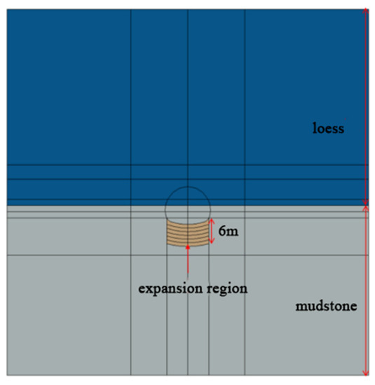Given that the volume expansion of mudstone, caused by variations in the mudstone moisture fields, is similar with the rise and shrinkage of the surrounding rock induced by temperature field variations [21,22], the “temperature comparison method” was employed. A corresponding numerical calculation model was established using the ABAQUS software to simulate the water absorption and expansion of the mudstone, with the expansion depth set at 6 m. This model facilitated the investigation of the pressure and lining force, as well as deformation characteristics of the tunnel surrounding rock at the midpoint of the step in the tunnel at the loess–mudstone intersection.