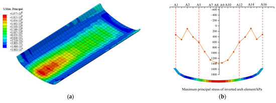Figure 13a illustrates the maximum principal stress cloud of the inverted arch, while Figure 13b presents the corresponding maximum principal stress curve of the inverted arch.