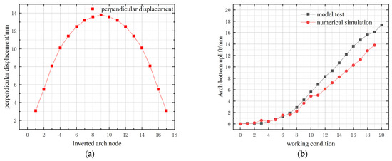 The vertical displacement cloud diagram of the rock of the tunnel cavern, as illustrated in Figure 14, reveals that the maximum displacement occurs at the base of the inverted arch and the left and right arch foot. Figure 15a demonstrates the numerical simulation of the vertical displacement for each node of the inverted arch, exhibiting a symmetrical distribution with the maximum vertical displacement (13.782 mm) appearing at the base of the inverted arch. Mudstone absorption of water and liquid water migration cause rapid expansion and deformation of the tunnel basement rock. A comparison of the inverted arch base in the loess–mudstone tunnel lining, obtained from model tests and numerical simulations, is shown in Figure 15b. These figures indicate that the elevation height of the arch base increases with the expanding height of the mudstone, and the development trend of the arch base elevation from the model test and numerical simulation is fundamentally consistent.