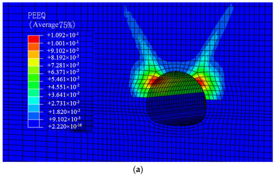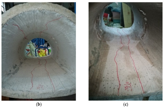 When the loess–mudstone interface is situated at the midpoint of the excavation’s mid-step, the plastic strain zone of the tunnel surrounding rock emerges above the mid-step of the tunnel excavation, as depicted in Figure 16a. The plastic strain is symmetrically distributed along the tunnel’s central axis, with the maximum plastic strain appearing at the left and right arch shoulders, the damage results of the lined arch shoulder in the corresponding model test are shown in Figure 16b,c above. In the construction and operation of the loess–mudstone tunnel in frozen soil regions, special attention should be paid to the safety of the tunnel drainage system and reinforcement structure in operation [23,24,25,26], thereby preventing the swelling of mudstone at the bottom of the tunnel, which leads to the deformation of the inverted arch at the base. This thus results in the damage of the lining system and directly threatens the safety of tunnel structure and operation. The equivalent plastic strain of the rock around the cavern and the model lining damage results are depicted in Figure 16.