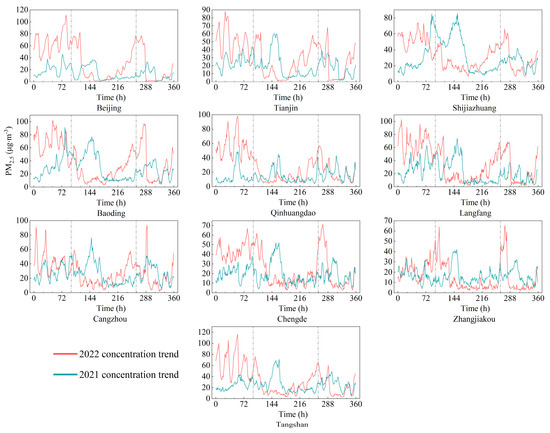 To study the trend of PM2.5 concentration in 10 cities in the Beijing-Tianjin-Hebei metropolitan area before and after the National Day in 2022 (4 days before and after, totaling 15 days and 360 h), the PM2.5 concentration data in the region were integrated into a continuous time series and compared with the trend during the same period in 2021, as shown in Figure 2.