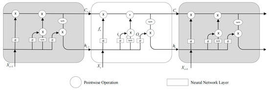 RNNs have achieved better results in time series prediction. However, one of the main problems faced by RNNs is the difficulty in modeling long-term dependencies, which is due to the gradient vanishing or explosion problem [47]. The LSTM network structure was introduced to solve this problem. LSTM networks are able to store and process long-term dependencies efficiently by introducing a new structure, the memory unit. The memory unit consists of three core components: input gates, forget gates, and output gates. Input gates are used to control the writing of external information to the memory cell, while forget gates and output gates determine whether information is retained or released at each time step. Figure 3 shows the overall structure of the LSTM model.