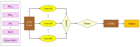The CNN-LSTM model integrates the better feature extraction ability of CNN and the ability of LSTM to deal with long time-dependent time series [49] to model PM2.5 concentrations in 10 cities in the Beijing-Tianjin-Hebei metropolitan area. In the CNN-LSTM model, the first half is a CNN network for feature extraction and the second half is an LSTM network for PM2.5 concentration prediction. The input data include the past 720 h of air quality data (PM2.5, PM10, SO2, NO2, O3, and CO) and auxiliary data (meteorological factors and ERA5-PWV). In this study, after passing through one convolutional layer, the data undergo normalization via Batch-normalization. The Relu activation function is employed to prevent gradient vanishing, and the output forecasts PM2.5 concentrations for the next 168 h. The specific CNN-LSTM model structure is illustrated in Figure 4.