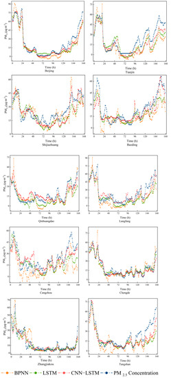 Table 4 shows that the CNN-LSTM model and the LSTM model exhibit better accuracy metrics compared to the BPNN. In terms of the RMSE metrics, the CNN-LSTM model has the best performance, except for Zhangjiakou, where the RMSE of the CNN-LSTM model is slightly larger than that of the LSTM model. Overall, the CNN-LSTM model has an average RMSE of 7.55 μg∙m−3, an average MAE of 5.94 μg∙m−3, and an average MAPE of 35.31%. Compared to the BPNN, the CNN-LSTM model has improved the average RMSE by 25.52%, the average MAE by 26.23%, and the average MAPE by 35.64%. Relative to the LSTM model, the CNN-LSTM model has improved the average RMSE by 14.30%, the average MAE by 15.01%, and the average MAPE by 16.98%. Among them, the CNN-LSTM model especially improves the prediction accuracy in Beijing, Tangshan, Langfang, and Qinhuangdao compared with the LSTM model, and its RMSE is optimized by 23.44%, 23.13%, 27.03%, and 21.09%, respectively. In addition, compared with the BPNN model, the prediction accuracy of the CNN-LSTM model in Baoding, Chengde, and Cangzhou is also significantly improved, with the RMSE optimized by 26.94%, 36.14%, and 31.71%, respectively.