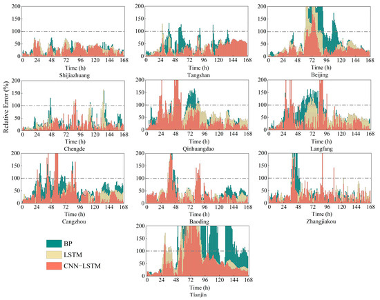 In particular, except for Zhangjiakou, the MAE and MAPE of the CNN-LSTM model are reduced respectively by 28.14% and 31.61% compared to the LSTM model in Beijing; 12.91% and 35.61% in Tianjin; 28.27% and 43% in Langfang; 14.92% and 27.78% in Qinhuangdao; 9.45% and 5.92% in Baoding; 10.64% and 3.35% in Shijiazhuang; 11.41% and 3.34% in Chengde; 7.81% and 12.91% in Cangzhou. In Shijiazhuang, by 10.64% and 3.35%; in Chengde, by 11.41% and 3.34%; and in Cangzhou, by 7.81% and 12.91%. Additionally, in the Tangshan area, the MAE of the CNN-LSTM model optimized by 12.14%, while the MAPE deteriorated by 46.06%. Combined with Figure 6, the relative error ratio of the CNN-LSTM starts to increase and exceeds that of the LSTM model from the 120th h to the 168th h, thus leading to the deterioration of its MAPE. Therefore, the length of the forward forecasting of PM2.5 concentration using the CNN-LSTM model in Tangshan should not exceed 120 h to achieve the best forecasting effect. However, despite this, the accuracy of the CNN-LSTM model in forward forecasting from 0 to 168 h still has a significant advantage over the LSTM model and BPNN in the other nine cities, especially in Beijing and Langfang.