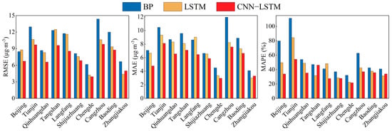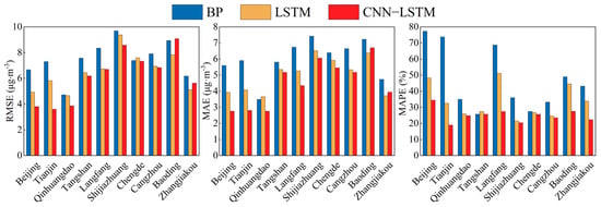 As indicated by Figure 8, during the same period in 2021, the CNN-LSTM model generally shows a clear advantage over the other two models. Specifically, the CNN-LSTM model has an average RMSE of 6.16 μg∙m−3, an average MAE of 4.52 μg∙m−3, and an average MAPE of 25%. When compared to the LSTM model, the RMSE, MAE and MAPE improved by 5.89%, 9.92%, and 25.55%, respectively. When compared to the BPNN model, they improved by 17.51%, 24.66%, and 46.61%, respectively. Additionally, comparing Figure 9, the CNN-LSTM model shows little difference in accuracy between the two years, and the advantage over the other two models is still most obvious in Beijing and least in Zhangjiakou, proving the temporal stability in the Beijing-Tianjin-Hebei region during the period before and after the National Day.