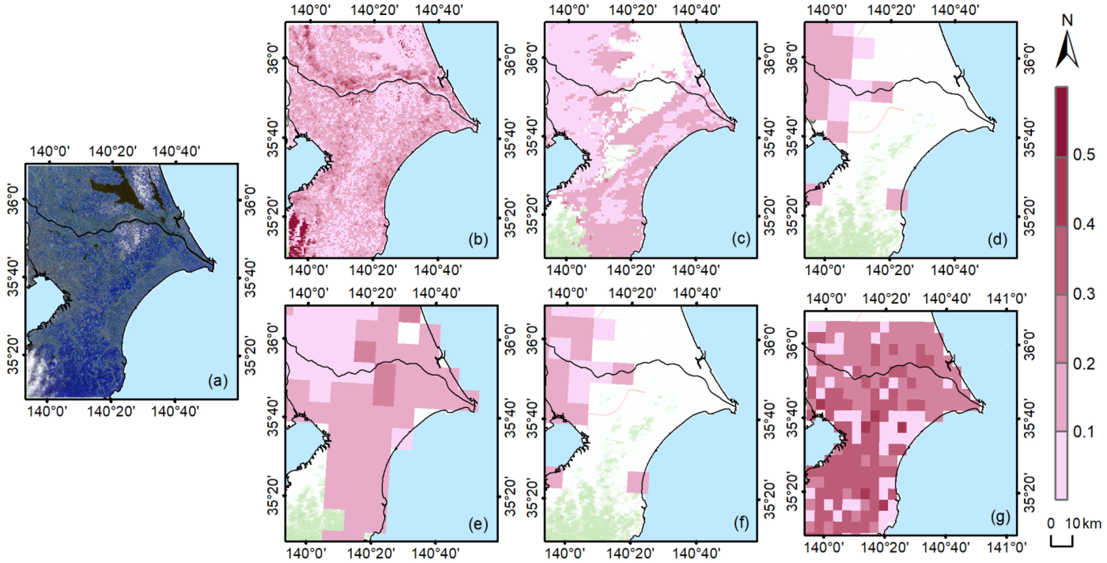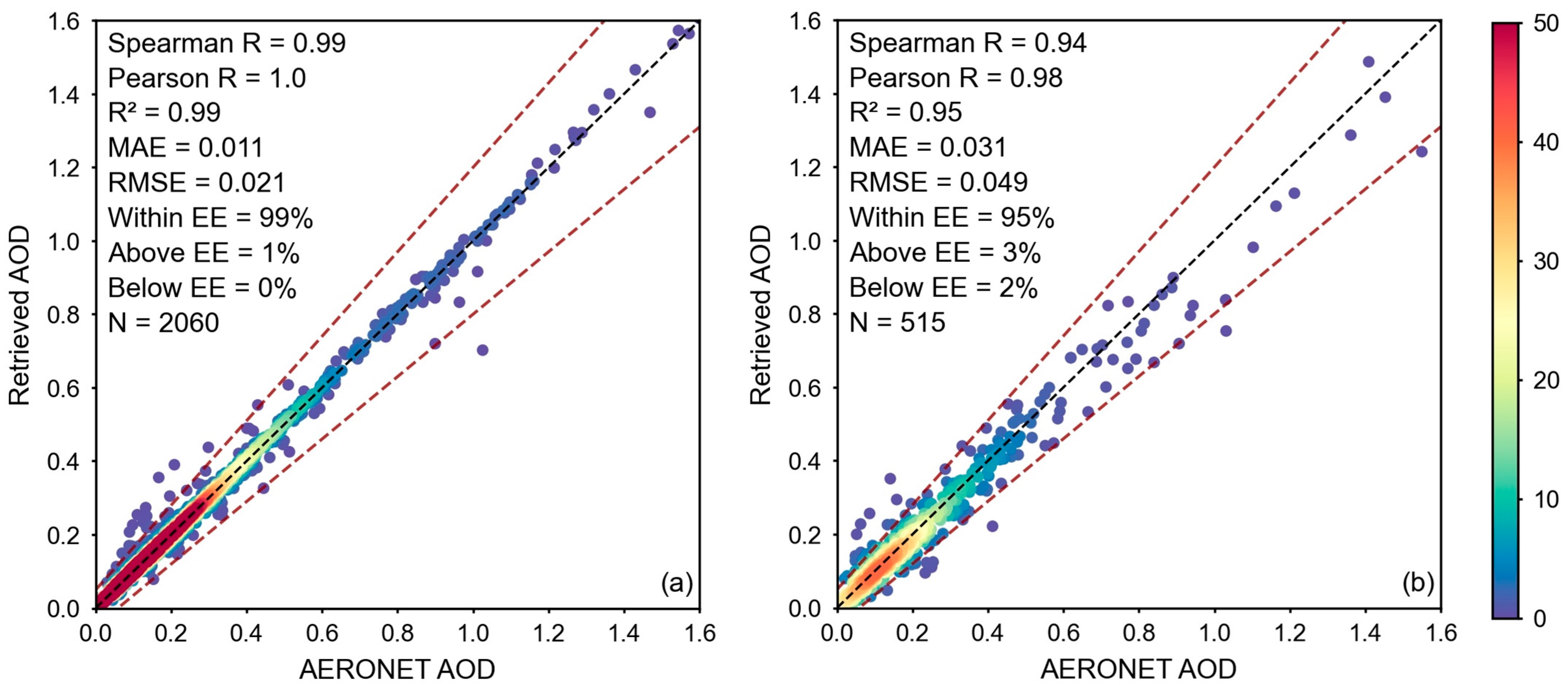 - CNN efficiently performs AOD retrieval on different land cover types: vegetation surface, urban, and bare soil. When the surface reflectance is high, the satellite sensors can obtain less information about aerosols, making it difficult to retrieve aerosols on a high-reflectance surface. However, CNN still shows great AOD retrieval potential on surfaces with high surface reflectance, such as urban and bare soil, with an R2 of 0.96 and 0.90 and RMSE of 0.051 and 0.042, respectively.