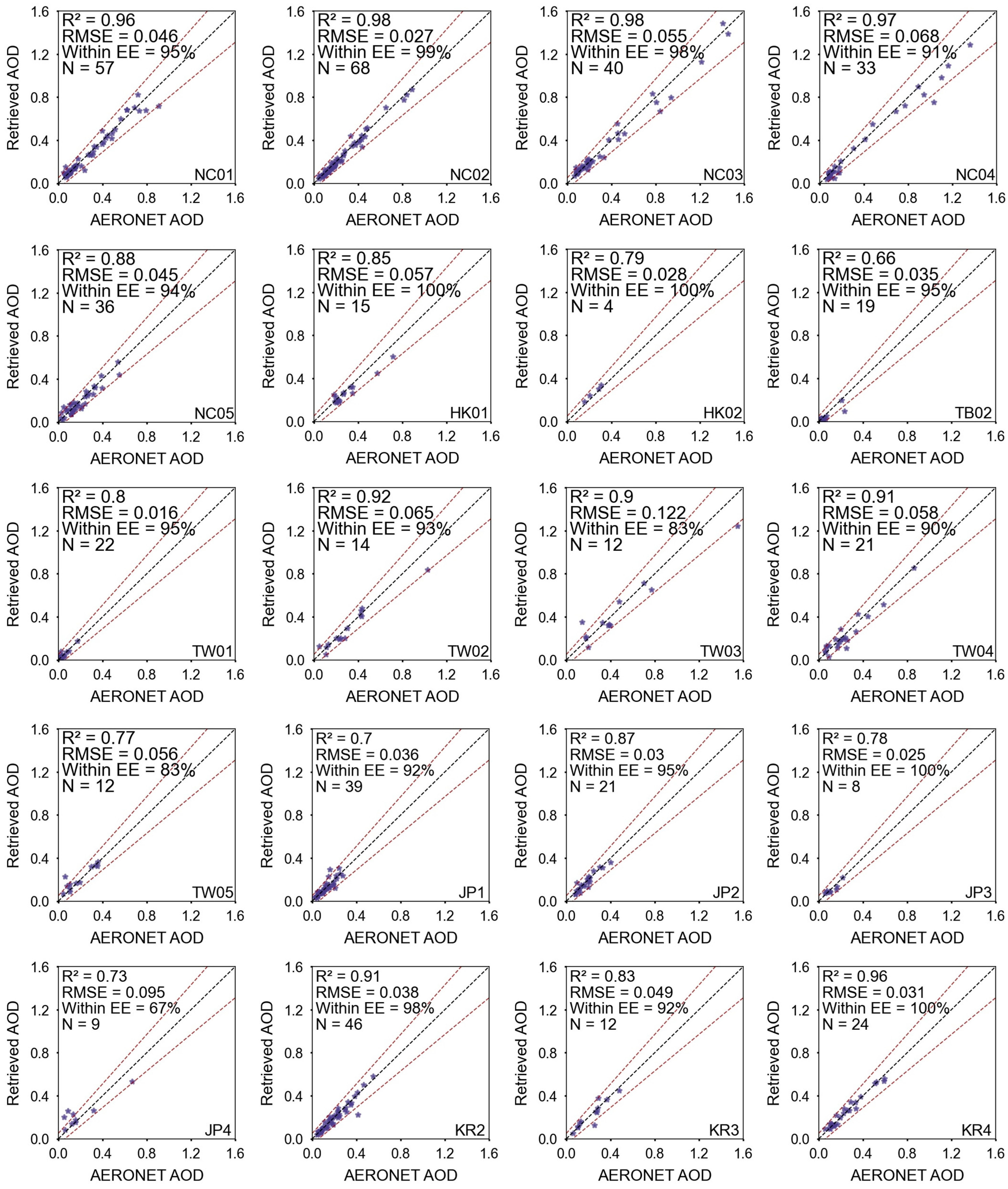 - The proposed model can accurately retrieve AOD, with an R2 of 0.95, RMSE of 0.049, and Within EE of 95% on the test dataset. The AOD-retrieval accuracy of CNN is higher compared with those of the DT, DB, DTB, MAIAC, YAER, RF, and VGG16 algorithms. In addition, CNN could provide continuous and detailed aerosol distribution to fill the observation gap in existing ground-based monitoring networks.