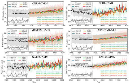 As shown in Figure 2, five GCMs and their ensemble mean ENS-CGMMN (hereafter called GCMs) are selected and employed for the inter-comparisons analysis at the temporal scale during historical and future periods. As for the first five GCMs, the curves in black, blue, green, orange, and red denote the arithmetic average of precipitation from their respective ensemble members (e.g., r1i1p1f1, r2i1p1f1), and the shadow areas represent the positive/negative standard deviations. Unlike the first five GCMs, the curves in ENS-CGMMN mean the arithmetic average of precipitation from the first five GCMs, while the shadow areas indicate the corresponding standard deviation. Apparently, all six GCMs overestimated precipitation amounts compared with reference precipitation observations during the historical period over China. Specifically, the multi-annual monthly average of precipitation during the historical period for the six models was 69.6, 66.3, 64.9, 72.1, 69.2 and 68.4 mm, respectively, while it was merely 52.1 mm for the reference precipitation observations. In this regard, the model MPI-ESM1-2-HR has the highest consistency with reference precipitation observations. Moreover, there are opposite trends in precipitation between six GCMs and reference data during the historical period. Therefore, it is unreasonable to apply precipitation simulations from GCMs before bias-corrections [103].