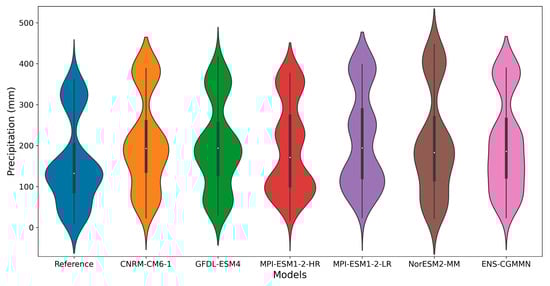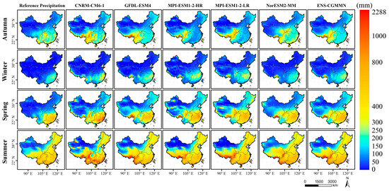Figure 3 shows the spatial inter-comparisons between reference precipitation and six GCMs’ precipitation at the seasonal scale during the historical period. Significant overestimations can be found in the adjacent regions of QTP and SW for the six models, where precipitation is most likely to have a large deviation in climate models, as well as in satellite and reanalysis-based precipitation products [106,107]. Specifically, in autumn, all six models showed sound performances in northerly areas of China, including XJ, NW, NE, NC and most parts of QTP, while all of them nearly failed to capture the actual spatial pattern in southerly areas (i.e., SW and SC). In the winter, the erroneous spatial precipitation patterns primarily appeared in SC and SW. However, in spring and summer, all seven subregions showed different degrees of spatial precipitation pattern errors, among which the CNRM-CM6-1, MPI-ESM1-2-LR, and NorESM2-MM resulted in comparatively greater precipitation overestimations. Therefore, GFDL-ESM4, MPI-ESM1-2-HR and ENS-CGMMN had relatively higher performances in capturing precipitation spatial patterns over China. Moreover, the performance of seasonal precipitation series from GCMs was also examined during the historical period. As shown in Figure 4, according to the median and density distributions, MPI-ESM1-2-HR presented the optimal performance among all models, compared with reference precipitation observations.
