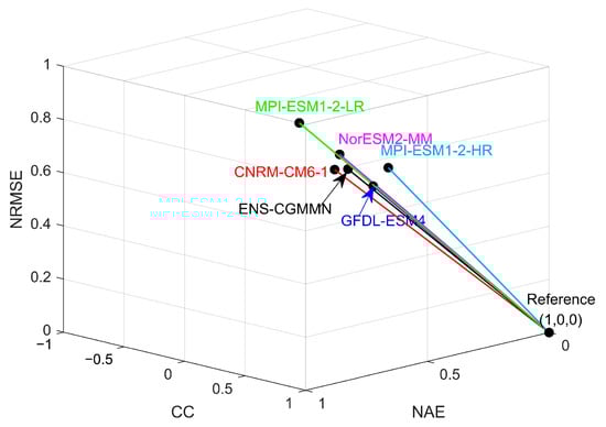 To compare and evaluate the performance of different GCMs/ENS-CGMMN depicting the actual precipitation, a comprehensive and sophisticated accuracy assessment method should be employed. Taylor diagram, a commonly used evaluation method, relates the “centered” root-mean-square error (RMSE), the pattern correlation coefficient (CC) and the standard deviation (SD) [87]. It shows what percentage of the RMSE can be attributed to the variance difference and what percentage may be attributed to insufficient pattern similarity [88]. However, several obvious limitations have been found as follows [89]: (1) the chosen statistical metrics must satisfy the cosine law, (2) the standard deviations in the Taylor diagram only describe the statistical characteristics of the models, not directly describing the model’s performances, and (3) it is difficult to distinguish a model’s performance when there are many simulated models, especially for models with similar performance. To overcome such issues, a sophisticated evaluation system, the DISO index, with physical mechanisms was developed by Hu et al. [89,90,91], which is extendable in terms of metrics. In light of this, the DISO index is preferable to the Taylor diagram for quantifying models’ overall performance [88]. Generally, three statistical indices, including CC, absolute error (AE), and RMSE, are used in the DISO index, which can be expressed as Equations (4)–(6):