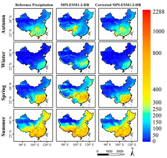 The quantile mapping (QM) method can effectively improve the projected performance of GCMs and enhance the accuracy of precipitation data at seasonal scales. The post-corrected MPI-ESM1-2-HR model in depicting actual precipitation improves significantly in numerical and spatial patterns in all seasons, especially in the exceptional high values located in the adjacent regions of the Qinghai-Tibet Plateau (QTP) and Southwest (SW). Therefore, at the seasonal scale, the calibrated MPI-ESM1-2-HR can be confidently used to calculate the standardized precipitation index (SPI) and related seasonal drought condition analysis, providing powerful support for future climate change and drought studies.