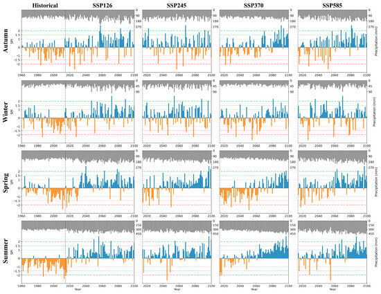 Variations of SPI at the time scale in the historical and future periods. The 1st, 2nd, 3rd and 4th rows are the SPI in autumn, winter, spring and summer, respectively, while the 1st and 2nd to 5th columns represent the variations of seasonal precipitation and SPI in historical and future periods. Specifically, the 2nd, 3rd, 4th and 5th stand for scenarios of SSP126, SSP245, SSP370 and SSP585, respectively, in the future period. Additionally, the horizontal dash lines in green and pink colors represent different drought levels described in Section 2.3.3.
